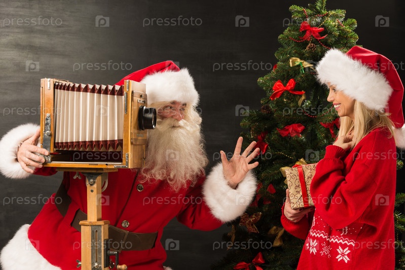 Санта-Клаус фотографирует жену с рождественским подарком