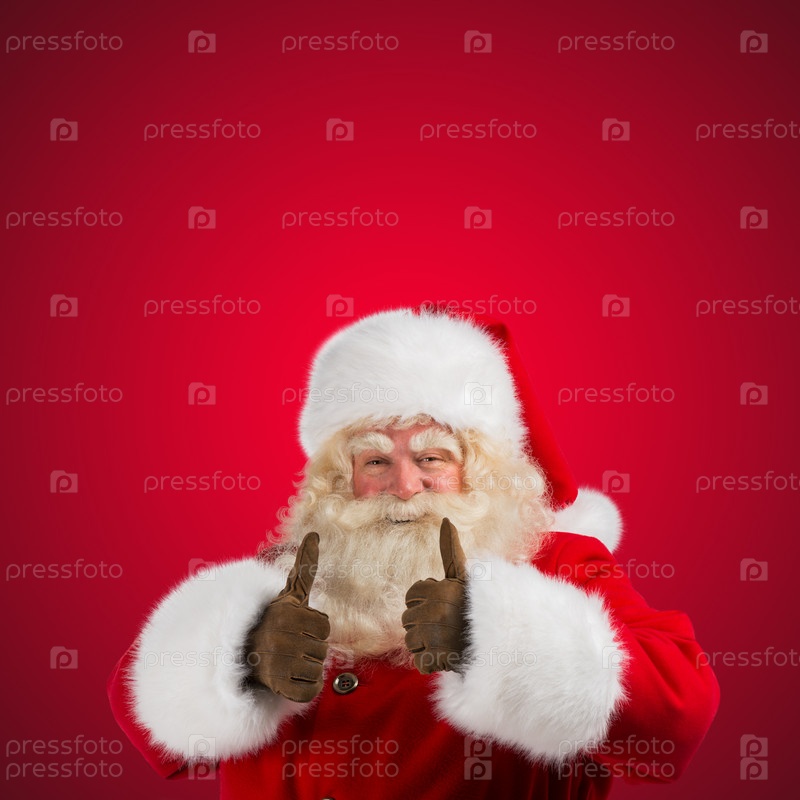 Санта-Клаус с поднятыми большими пальцами, изолированный на красном фоне
