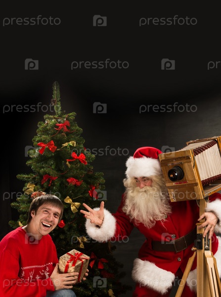 Санта-Клаус фотографирует мужчину с подарком на старую фотокамеру