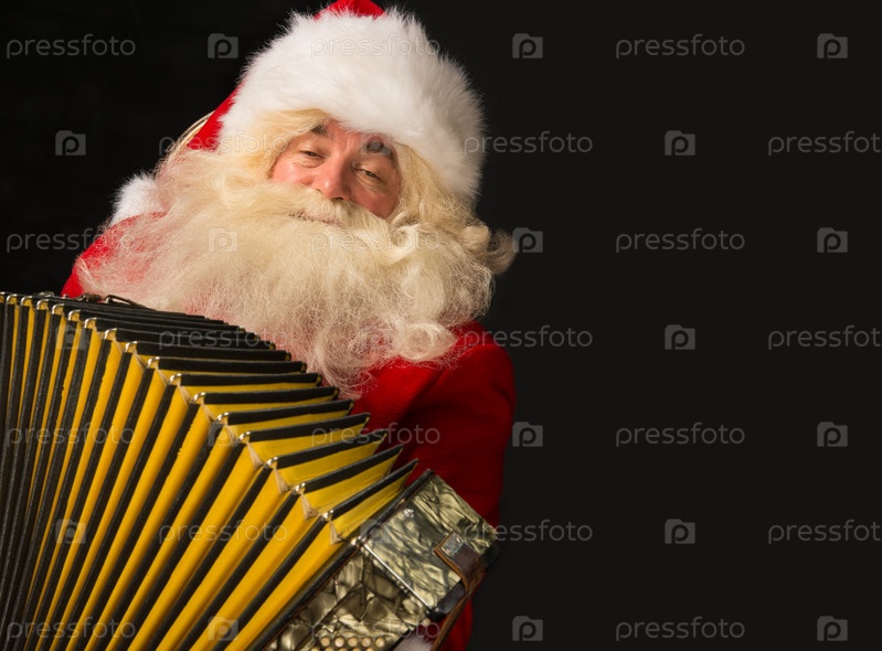 Санта-Клаус в кресле играет на аккордеоне. Рождественское веселье
