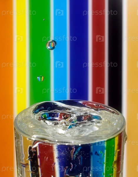 Три капли падают в стакан с водой на полосатом фоне