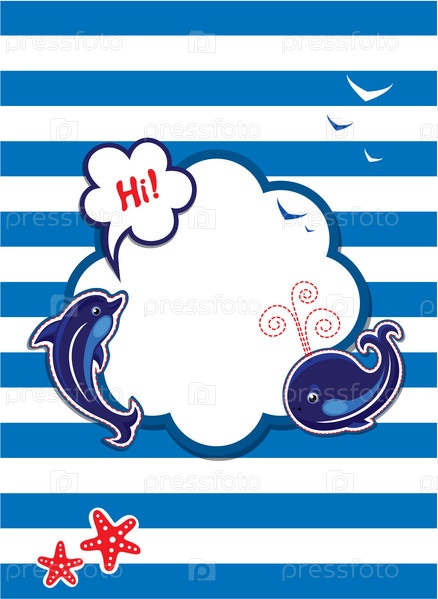 Смешная открытка с дельфином, китом и пустая рамка для текста на полосатом фоне
