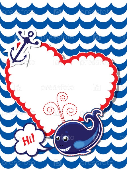 Смешная открытка с китом, якорем и пустая рамка для текста на полосатом фоне