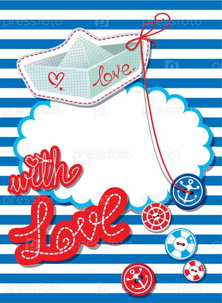 Смешная открытка с кораблем, пуговицами и пустая рамка для текста на полосатом фоне