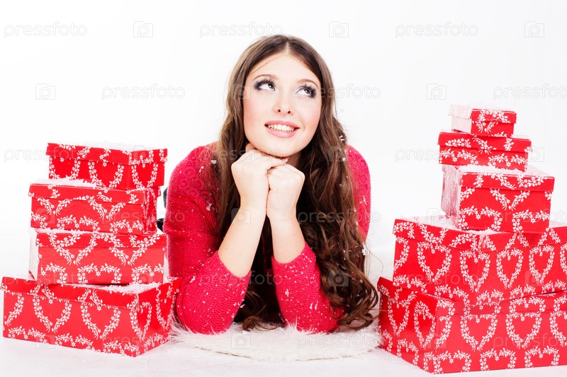 Улыбающаяся женщина с подарочными коробками, изолированная на белом фоне