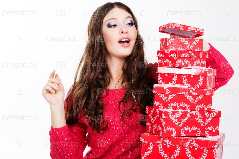 Улыбающаяся женщина с подарочными коробками, изолированная на белом фоне