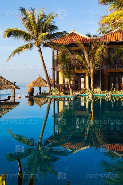 Бассейн и пальмовое дерево на фоне неба