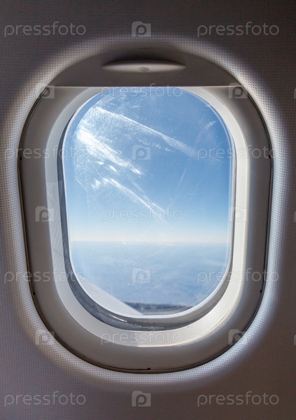 Голубое небо и облака в иллюминаторе