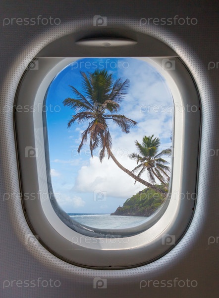 Вид на пляж и пальмы через иллюминатор