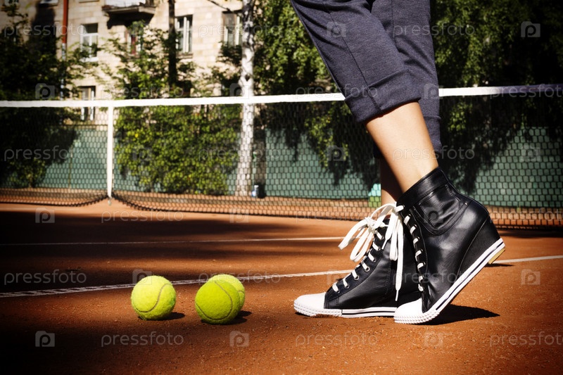 Теннисные мячи и ноги на теннисном корте