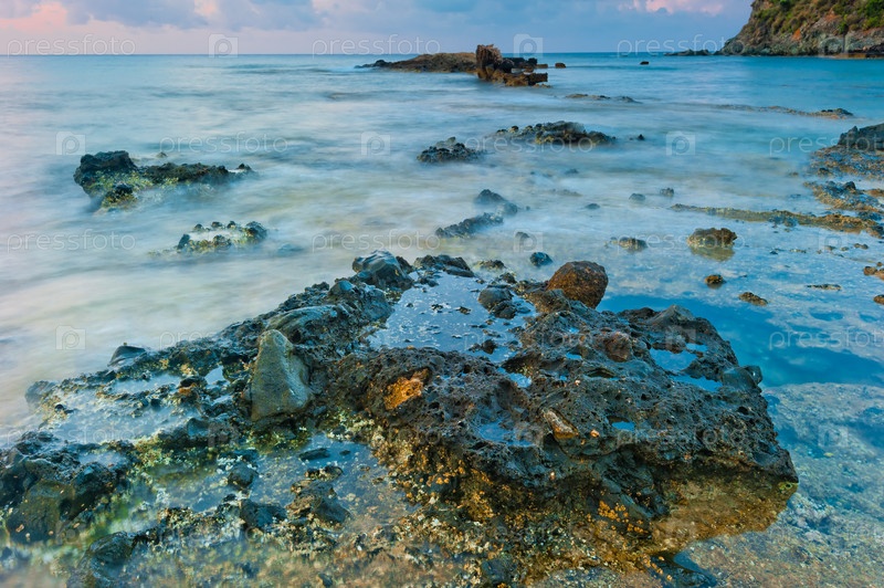 Камни и движущаяся вода в море на рассвете