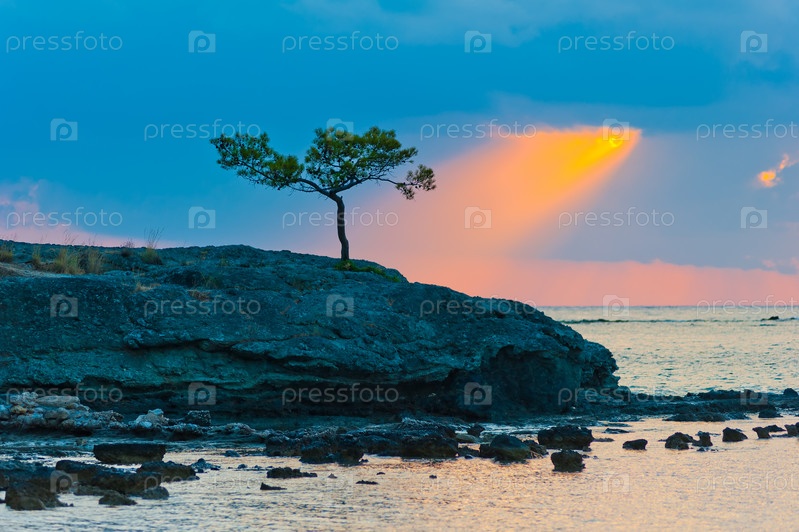 Одинокая сосна на скалистом берегу и солнечный луч