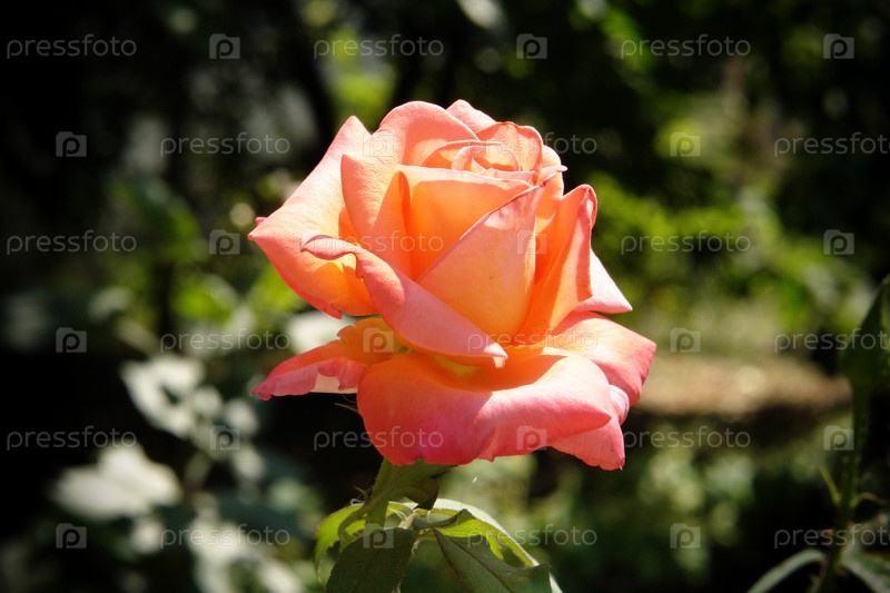 Оранжево-красная роза в солнечных лучах в саду на фоне зелени