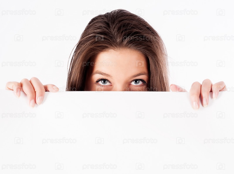 Женщина прячется за баннером