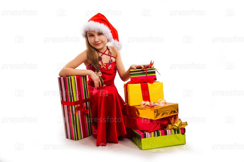 Девочка в колпаке Санты с рождественскими подарками