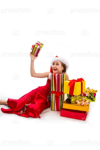 Девочка в колпаке Санты с рождественскими подарками