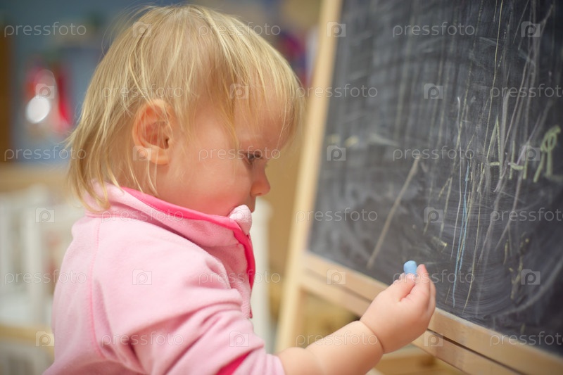 Маленькая девочка пишет мелом на доске