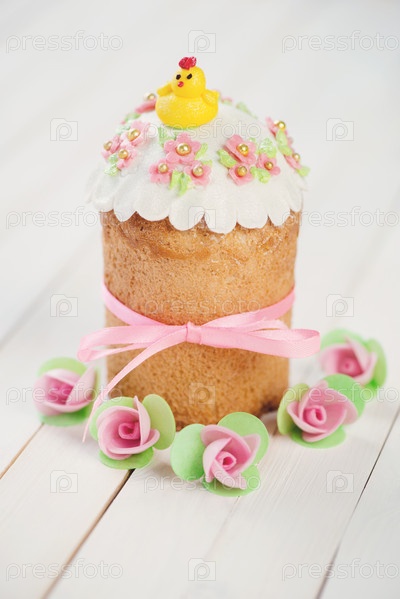 Украшенный кулич, белый деревянный фон