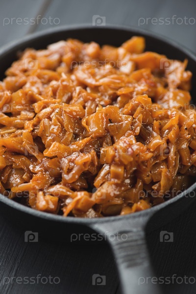 Чугунная сковорода с тушеной капустой крупным планом