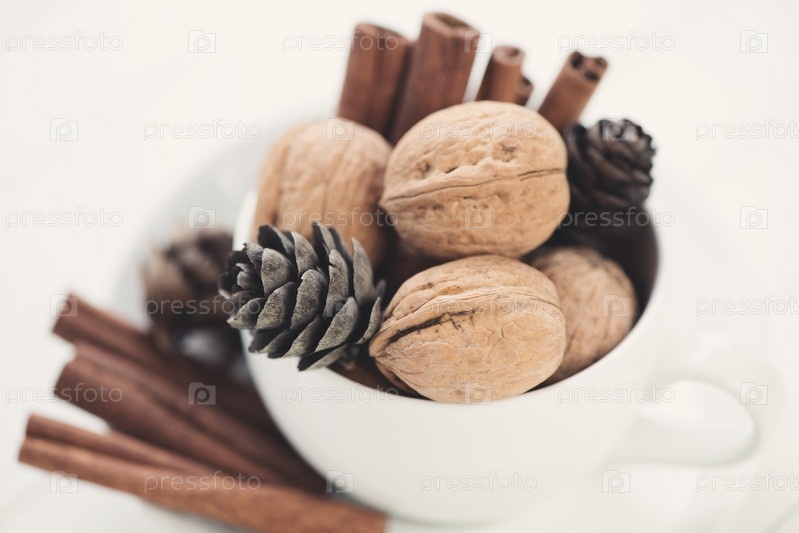 Грецкие орехи, корица и шишки в чашке крупным планом