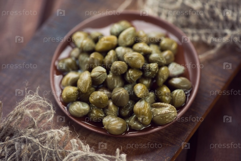 Керамическая тарелка с маринованными каперсами, деревенский деревянный фон