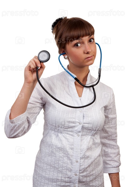 Портрет молодой девушки со стетоскопом на белом фоне