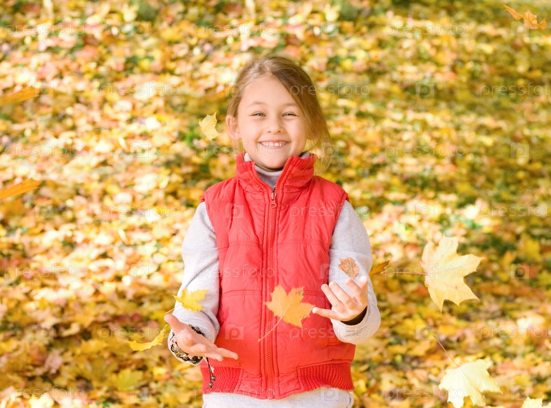 Девочка ловит желтые листья