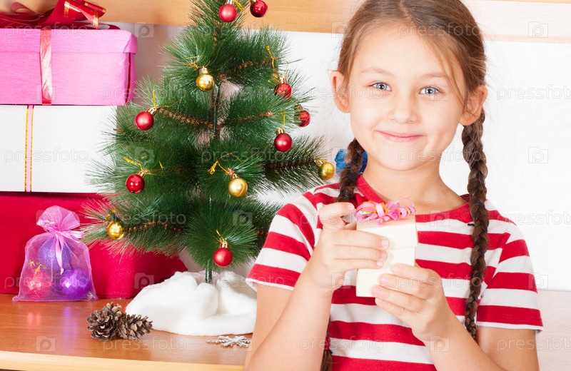 Девочка с новогодним подарком в руках