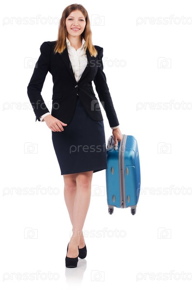 Женщина с чемоданом на белом фоне