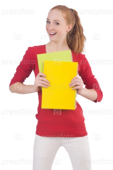 Молодая студентка с книгами на белом фоне