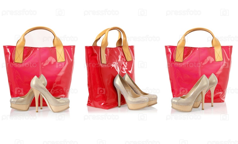 Коллаж из обуви и сумок на белом фоне