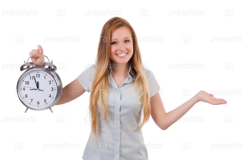 Молодая женщина с часами на белом фоне
