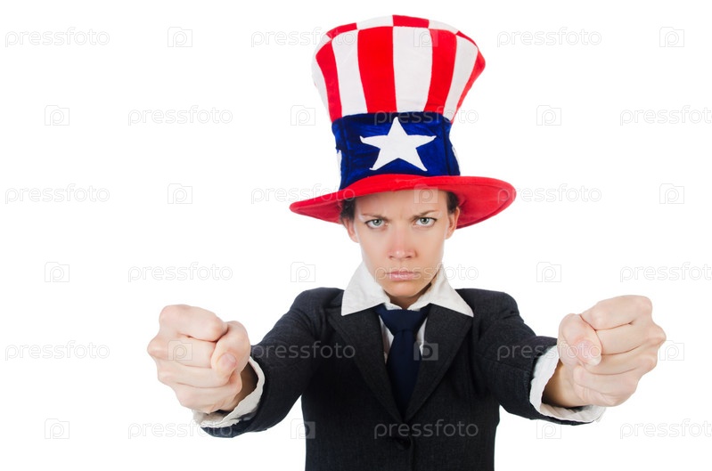 Молодая женщина с американскими символами на белом фоне