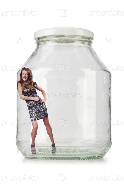 Женщина в стеклянной банке, изолированная на белом