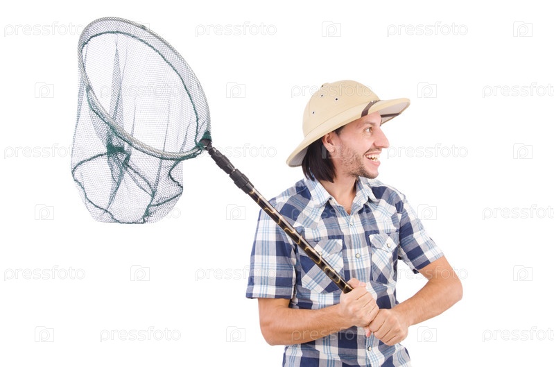 Забавный парень с сачком на белом фоне