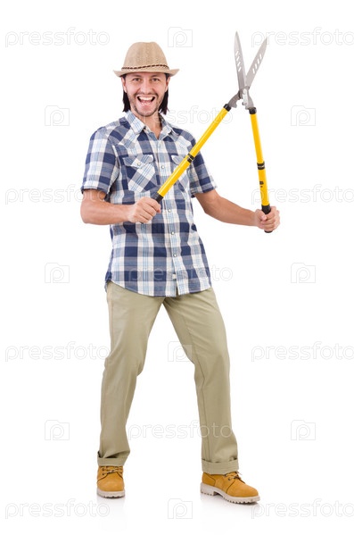 Забавный парень с садовыми ножницами на белом фоне