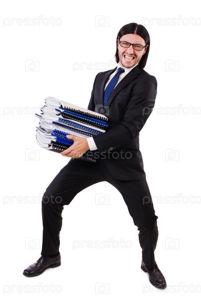 Забавный человек с большим количеством документов на белом фоне
