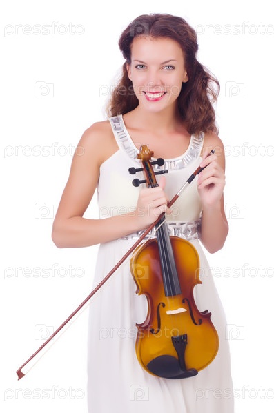 Молодая девушка со скрипкой на белом