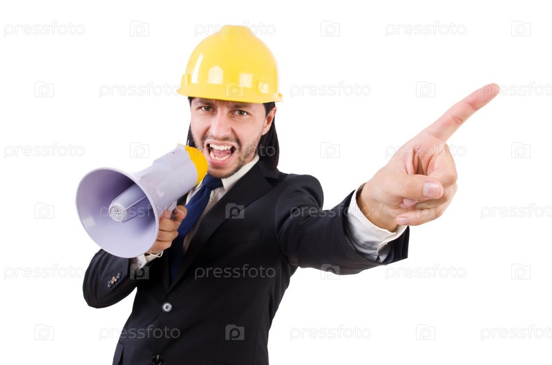Человек со шлемом и громкоговорителем на белом фоне