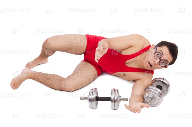 Забавный парень делает упражнения с гантелями на белом фоне