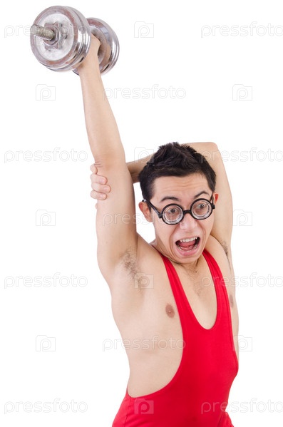 Забавный парень делает упражнения с гантелями на белом фоне