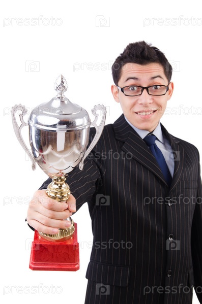 Забавный парень получает награду на белом фоне