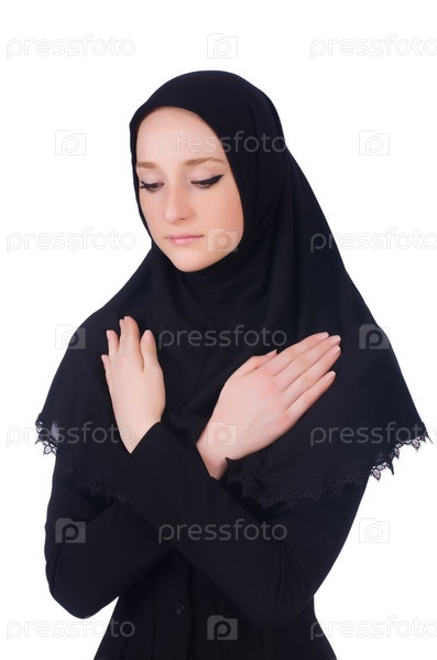 Молодая мусульманка молится, изолированная на белом