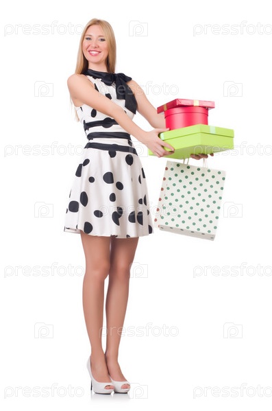 Молодая женщина с рождественскими покупками на белом фоне