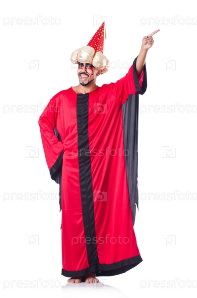 Маг в красном костюме, изолированный на белом фоне
