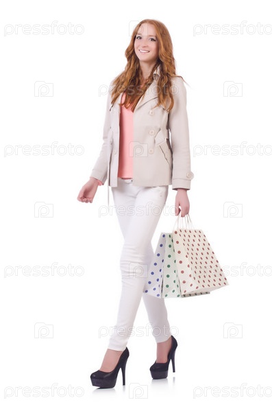 Девушка с покупками на белом фоне