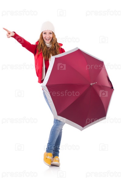 Молодая женщина с зонтиком на белом фоне