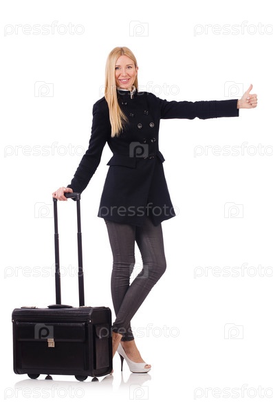 Бизнес-леди с чемоданом на белом фоне