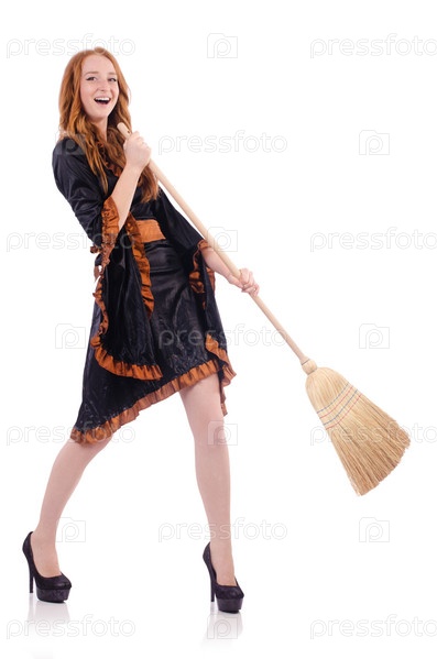 Симпатичная ведьма с метлой на белом фоне