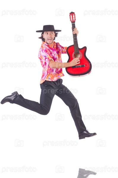 Человек с гитарой, изолированный на белом